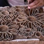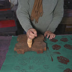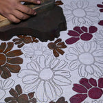 Artist wood block printing flowers onto cotton fabric