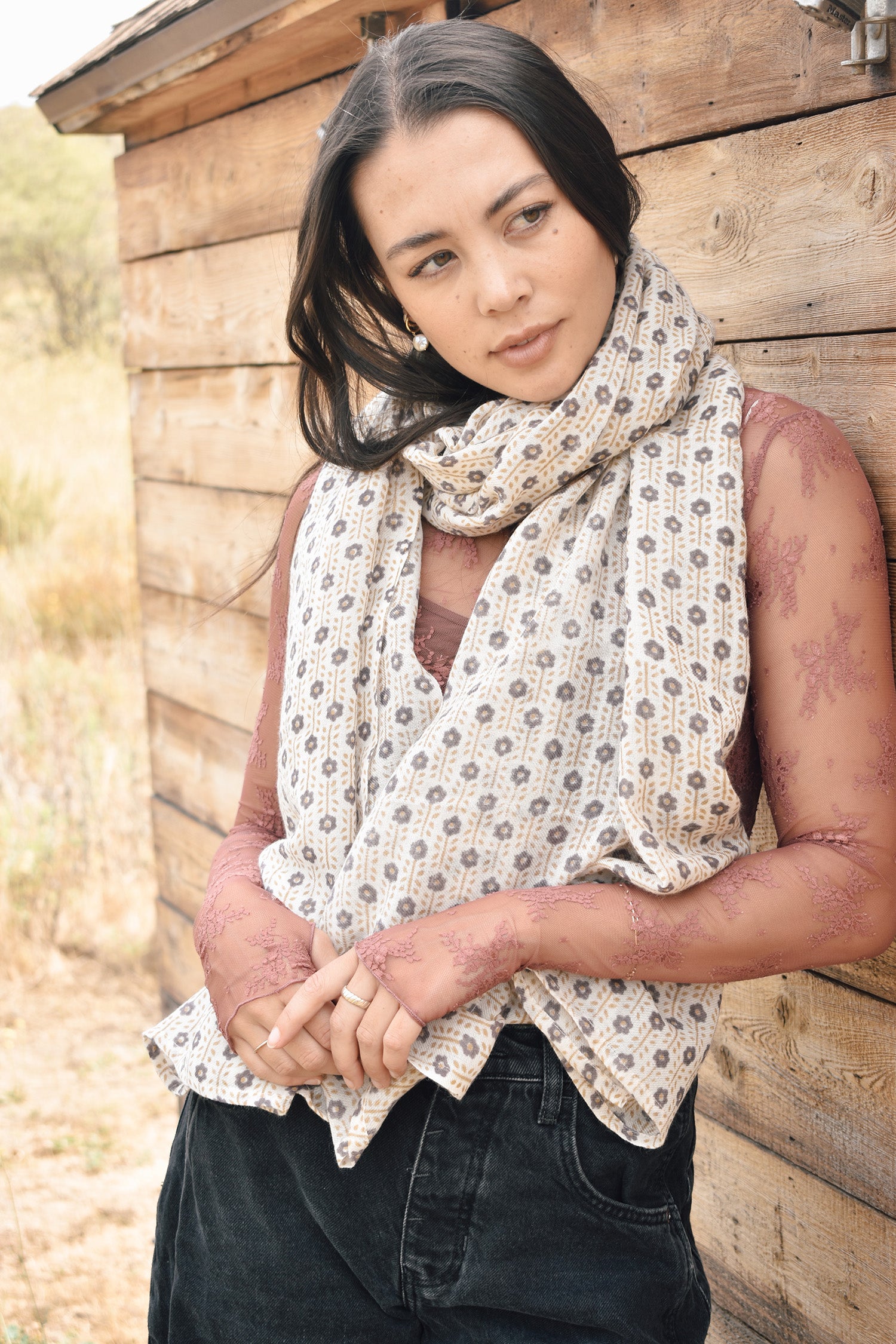 Block printed onto a lightweight wool at the perfect chunky length, the Eira was designed to be a versatile accessory you could wear with anything, from chunky coats to baggy sweatshirts to flannel pjs. The Eira and its dainty floral print will be your best friend all winter long, keeping you bundled, warm, cozy and chic.