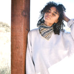 Woman wearing block print Frontier bandana tied around neck against a grey sweatshirt. Woman leaning against wooden pillar.