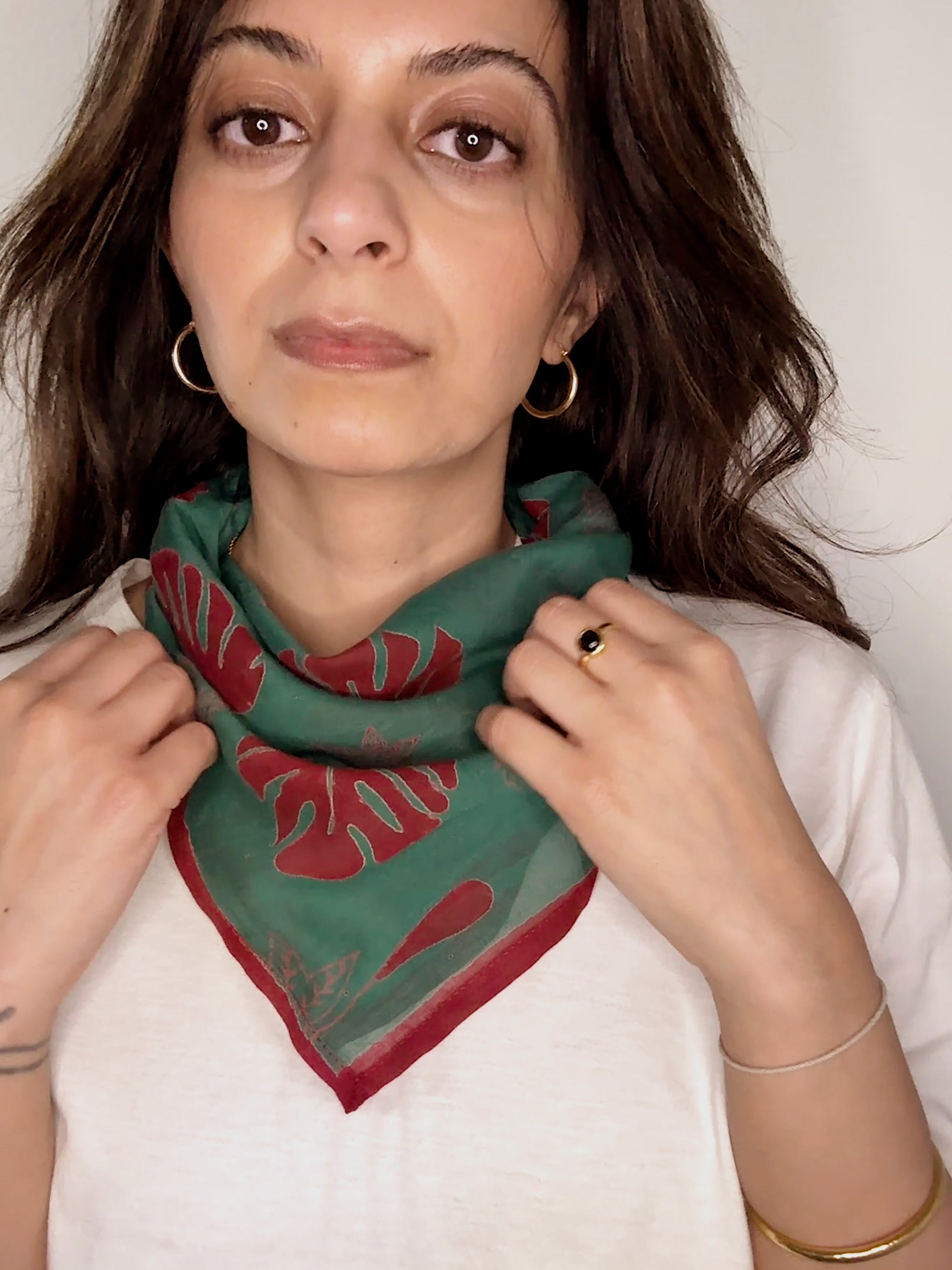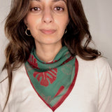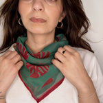 Woman wearing block printed red and green Monstera bandana around the neck