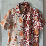 Close-up of a person wearing a patterned shirt with floral and abstract designs.