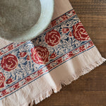 Block printed Rosebud hand towels, folded and laid flat. Towels have a rose border print.