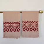 Block printed Terracotta hand towels, folded and laid flat. Towels have a geometric, diamond print.