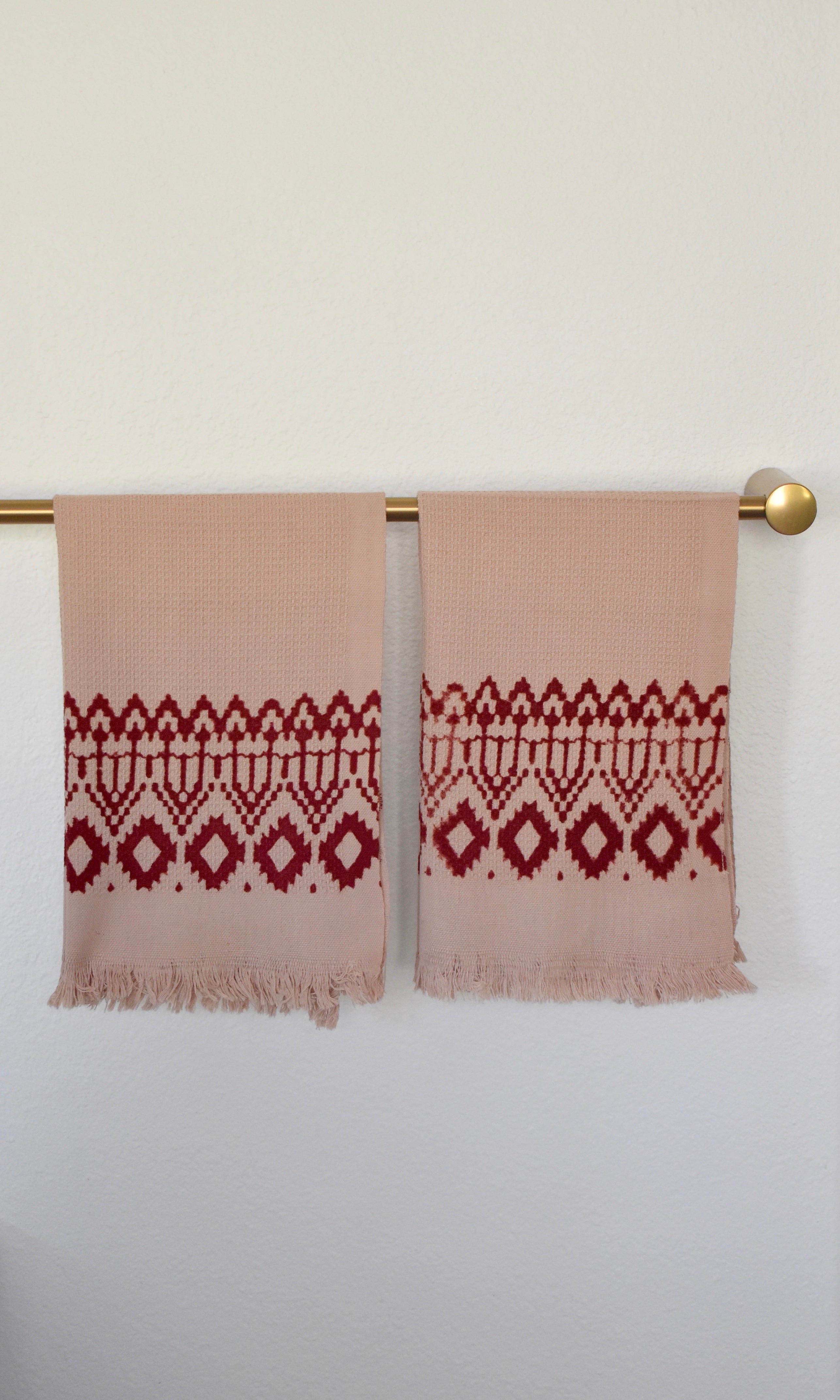 Block printed Terracotta hand towels, hanging on a golden rod. Towels have a geometric, diamond print.